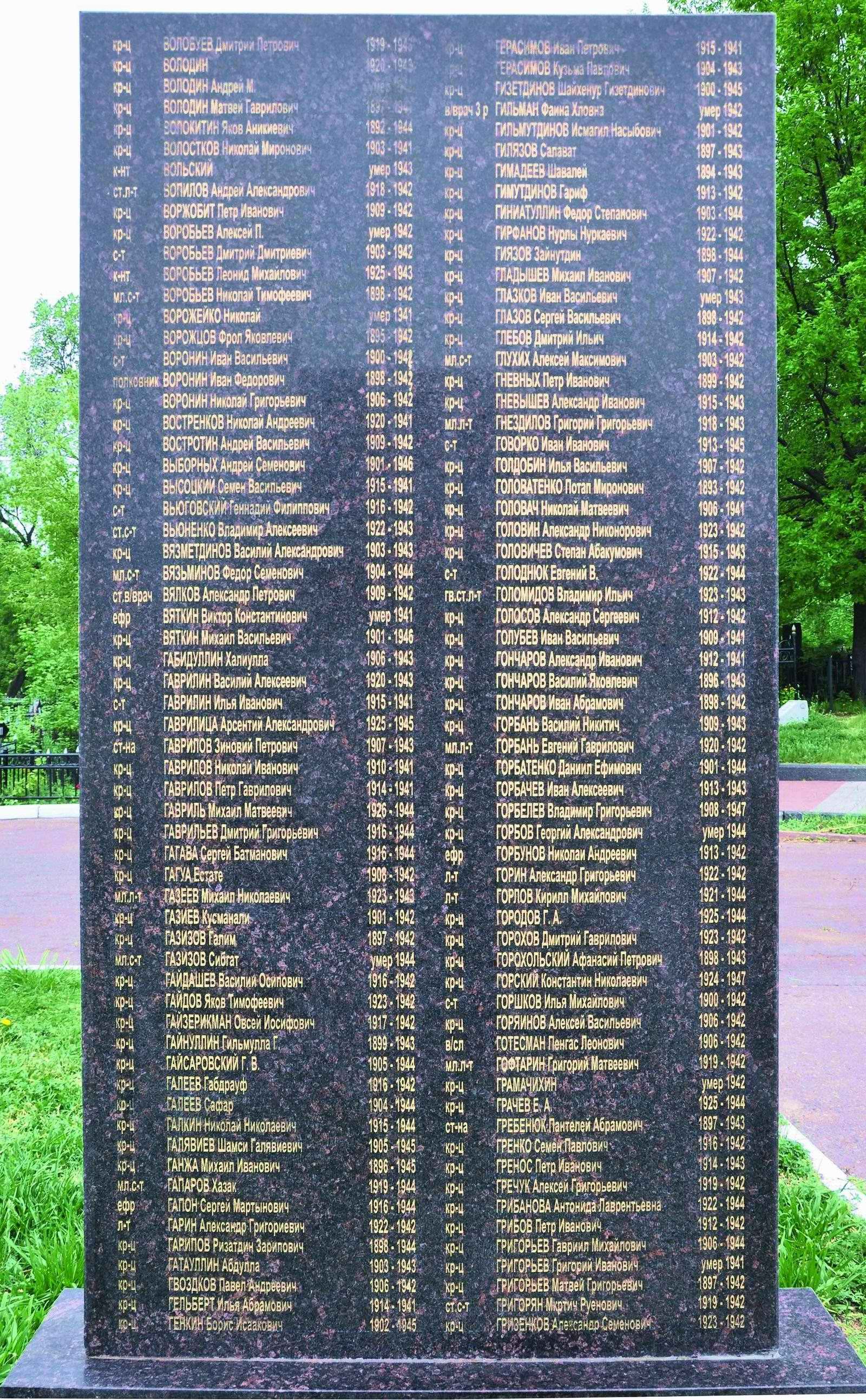 Сведения о похороненных в Татарстане воинах постоянно уточняются, за информацией обращайтесь в Всероссийский информационно-поисковый центр «Отечество» (г.Казань): телефон: +7-(843)-555-02-55, e-mail: mipc@mail.ru.