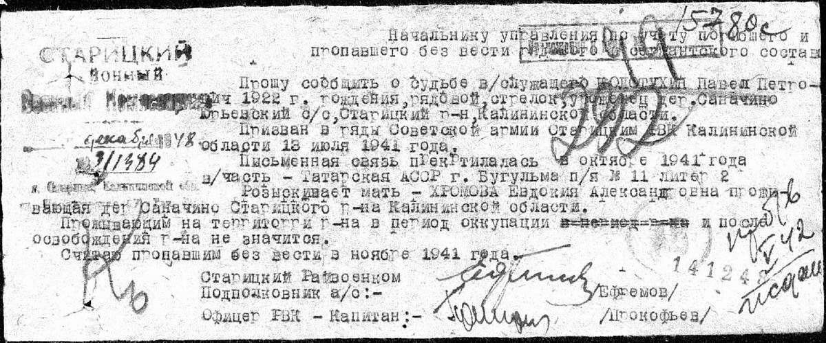 Для сведения: согласно материалам размещенным на интернет-портале Министерства обороны Российской Федерации (Обобщенная база данных «Мемориал») в донесении Старицкого РВК Калининской области от 6 декабря 1948 года говориться: «…Письменная связь прекратилась в октябре 1941 года, адрес военной части: Татарская АССР, г.Бугульма, п/я № 11 литер 2…».