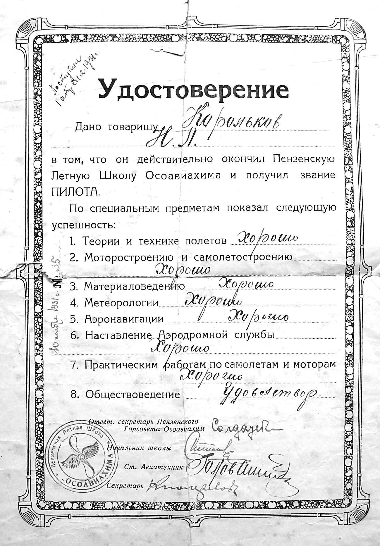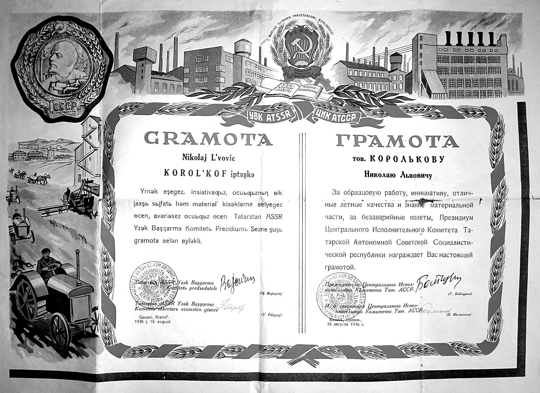После окончания учебного заведения был направлен в город Казань на должность летчика Казанского аэропорта. Отличные качества летчика Николая Королькова были отмечены в 1936 году грамотой Центрального Исполнительного Комитета Татарской АССР: «…За образцовую работу, инициативу, отличные летные качества и знание материальной части, за безаварийные полеты Президиум Центрального Исполнительного Комитета Татарской Автономной Советской Социалистической республики награждает Вас настоящей грамотой…».