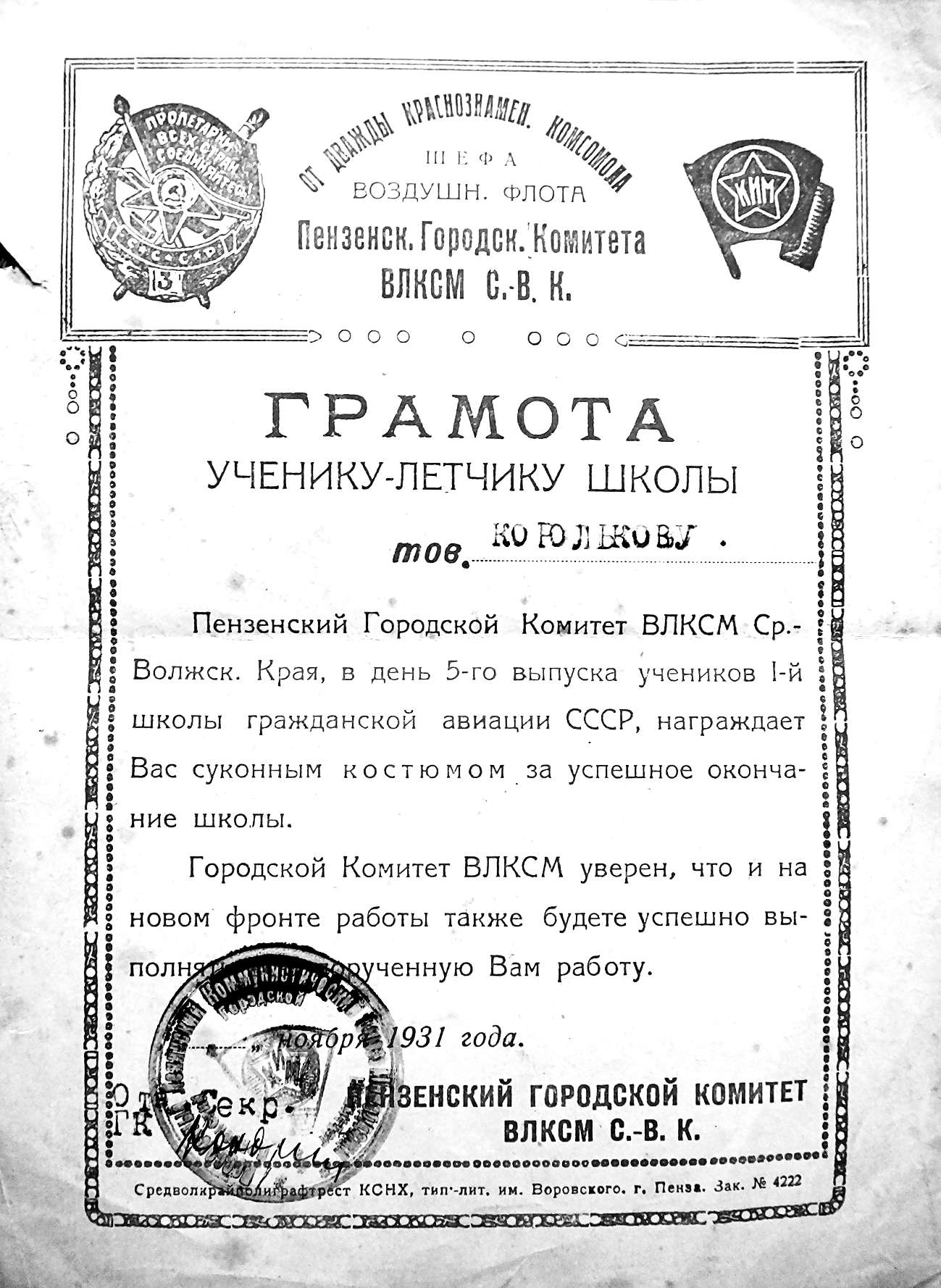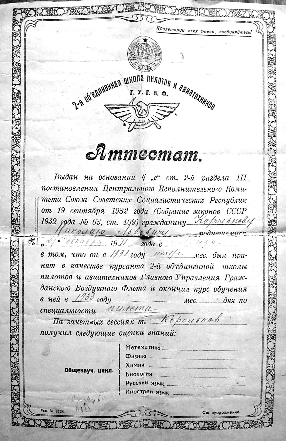 В период с ноября 1931 по ноябрь 1933 года обучался в качестве курсанта-пилота во 2-й Объединенной школе пилотов и авиатехников Главного управления Гражданского воздушного флота (2-я авиашкола Гражданского воздушного флота СССР им. Петрова).