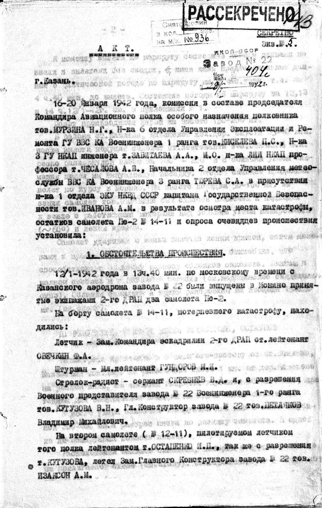 В составе экипажа 2-го авиационного полка дальней разведки Главного Командования РККА погибли: летчик капитан Овечкин Ф.А., штурман лейтенант Гундоров М.И., воздушный стрелок-радист сержант Скребнев В.Д. На борту самолета находился главный конструктор самолета Пе-2 Владимир Михайлович Петляков.