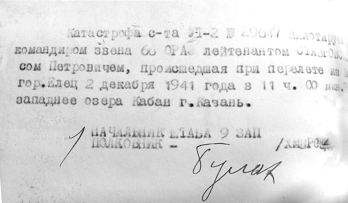2 декабря 1941 года в 10.50 с Казанского аэродрома экипаж был выпущен в полет командиром 9 ЗАП. Проведя нормально взлет, сделав полтора круга над аэродромом, набрал высоту 300 метров, взял курс 220 градусов, пошел по заданному маршруту. Мотор работал нормально. Пролетая озеро Кабан, мотор давал обороты – 1400, самолет накренился вправо, перешел на нос и в таком положении с работающим мотором врезался в землю.