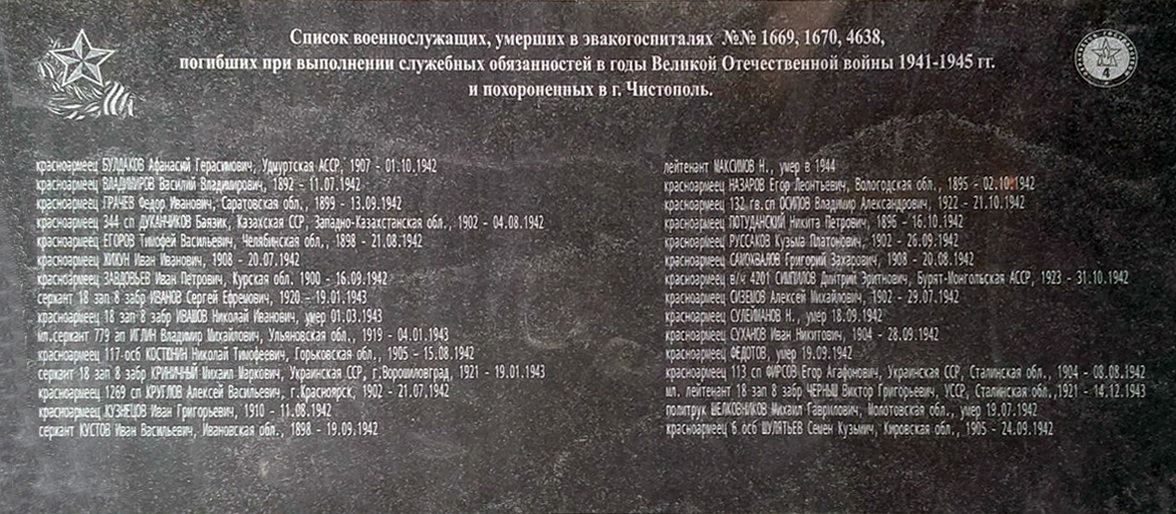 Сведения о похороненных в Татарстане воинах постоянно уточняются, за информацией обращайтесь в Всероссийский информационно-поисковый центр «Отечество» (г.Казань): телефон: +7-(843)-555-02-55, e-mail: mipc@mail.ru.