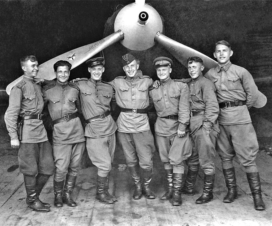 Летчики 102-го гвардейского истребительного авиаполка в капонире рядом с "Аэрокоброй", борт 33.