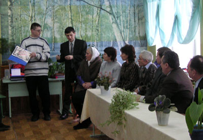 Вручение семье Насретдина Тазиева памятной папки с вкладышем медальона отца и кисета с землей с места его захоронения.