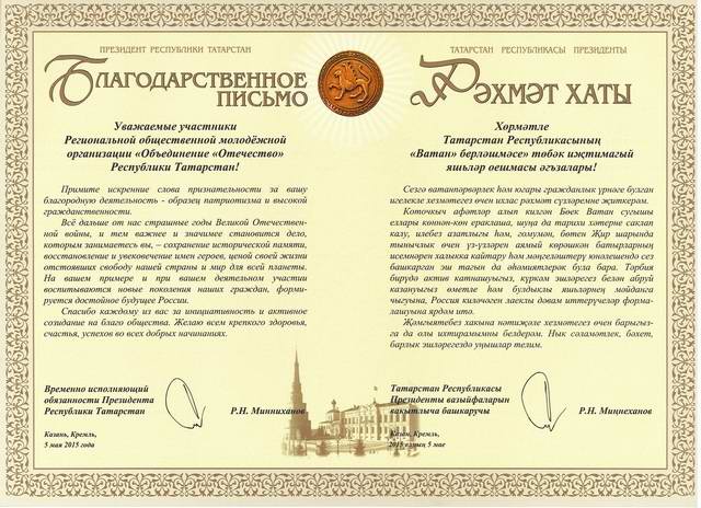 Коточкыч афәтләр алып килгән Бөек Ватан сугышы еллары көннән-көн ераклаша, шуңа да тарихи хәтерне саклап калу, илебез азатлыгы һәм, гомумән, бөтен Җир шарында тынычлык өчен үз-үзләрен аямый көрәшкән батырларның исемнәрен халыкка кайтару һәм мәңгеләштерү юнәлешендә сез башкарган эш тагын да әһәмиятлерәк була бара. Тәрбия бирүдә актив катнашуыгыз, күркәм эшләрегез белән абруй казануыгыз өметле һәм булдыклы яшьләрнең мәйданга чыгуына, Россия киләчәген лаеклы дәвам иттерүчеләр формалашуына ярдәм итә. Җәмгыятебез хакына нәтиҗәле хезмәтегез өчен барыгызга да олы ихтирамымны белдерәм. Нык сәламәтлек, бәхет, барлык эшләрегездә уңышлар телим.