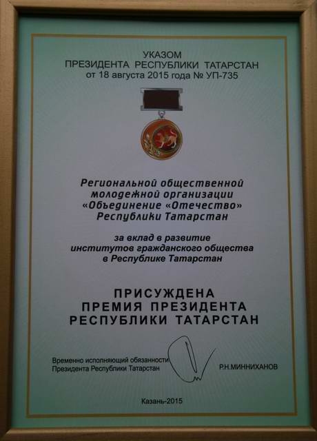 19 августа 2015 года в рамках проводимого в Казани III-го Республиканского форума социально ориентированных некоммерческих организаций временно исполняющий обязанности Президента Республики Татарстан Р.Н.Минниханов вручил Региональной Общественной Молодежной Организации «Объединение «Отечество» Республики Татарстан диплом и почетный знак победителя конкурса на соискание Премии Президента Республики Татарстан за вклад в развитие институтов гражданского общества в Республике Татарстан.