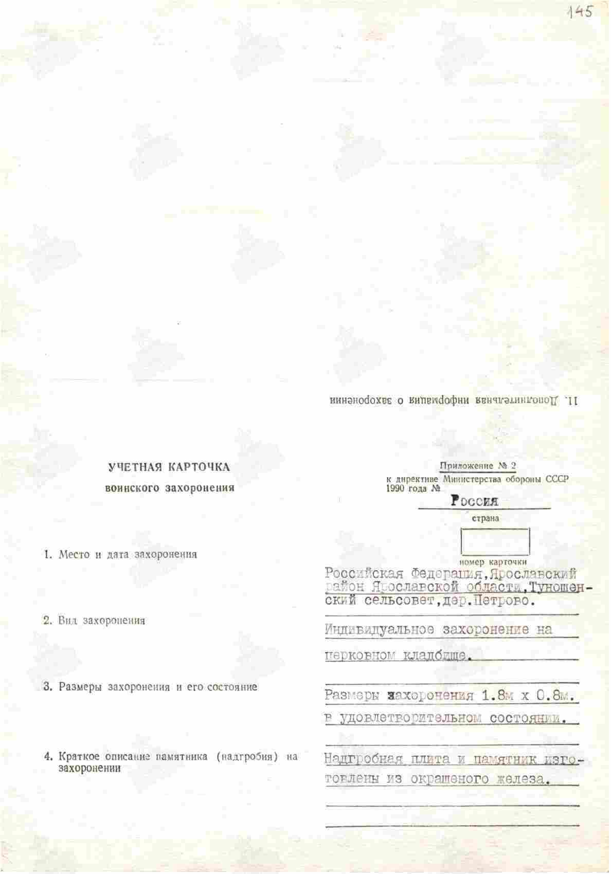 Но, как оказалось далее, эти документы в архиве Минобороны России оказались не единственными. Установив дополнительные поисковые опции в системе «Память Народа», уже по месту гибели, удалось выйти на следующий пласт документов, которые уточняли фамилию штурмана и указывали точное место его захоронения. Так, в нашем распоряжении появилась переписка Ярославского РВК Ярославской области с родными Павла Александровича. В этих документах выяснилось, что правильная фамилия погибшего, не Стрижанов, и не Стрыжаков, а – Стрижаков. Оказывается, что еще в 1971 году мать Павла Александровича – Анна Ивановна Стрижакова, обратилась в адрес военкома с просьбой сообщить о состоянии могилы своего сына. И для Ярославского райвоенкома это было открытием. Благодаря этому обращению, также удалось выяснить, что географически могила погибшего штурмана самолета, в действительности находится в д.Петрово, рядом с Петропавловской церковью. Дело в том, что деревни Телищево и Петрово соседствуют друг с другом, и их разделяет всего лишь железная дорога, идущая из Ярославля на Нерехту. А старое кладбище, которое использовалось в военные годы, как раз и находится в деревне Петрово. Так, благодаря этой переписке, могила штурмана самолета 58-го бомбардировочного авиационного полка младшего лейтенанта Павла Александровича Стрижакова была поставлена на государственный учет как воинское захоронение. Это подтверждается и размещенными на сайте «Память Народа» двумя учетными карточками воинского захоронения от 1996 и 2011 годов. Кроме этого, необходимо добавить, что данное захоронение находится в северо-восточной части прицерковного кладбища, в 12 метрах от углового столба ограды в направлении Петропавловской церкви.