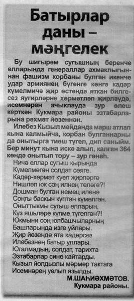 Заметка в газете "Безнен газит" ("Наша газета") от 6 мая 2009 г. Стихи посвящены поисковикам Кукморского района.
